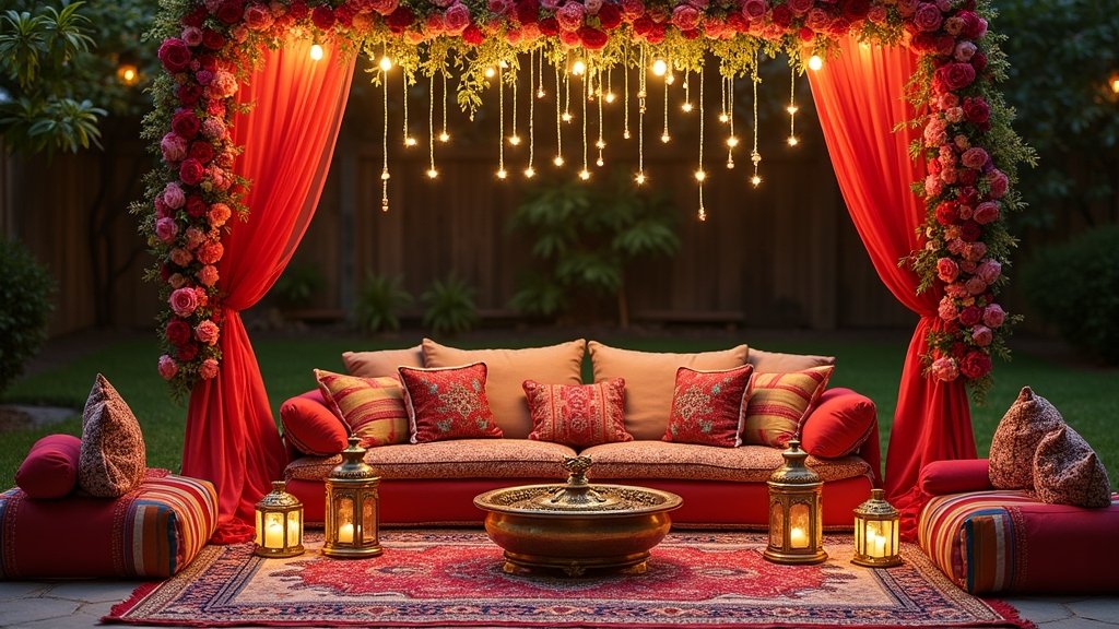 Ready to create a stunning Mehndi celebration at home? Picture vibrant floral backdrops, bursting with marigolds and roses that smell divine! Hang colorful draperies for that waterfall effect, and don’t forget whimsical lanterns with twinkling fairy lights for that magical glow. A gorgeous dholki centerpiece surrounded by sweets will make your guests smile! Want to turn up the fun? DIY dreamcatchers can add that boho charm! Stay with me, and I’ll share even more fabulous ideas!