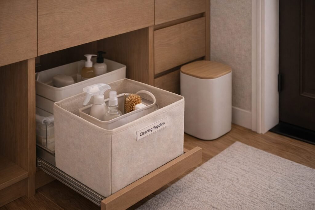 The calmest bathrooms use fewer container types. Choose one “hidden clutter” bin style (solid) and one “quick visibility” style (clear).