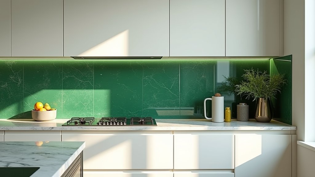 Emerald glass panels stand out against sleek cabinetry like a gem in a crown. Think about pairing them with brass accents for a taste of luxury or dark wood for contrast; the possibilities are endless! And hey, if you’re feeling adventurous, why not extend those panels all the way to the ceiling? Your kitchen will practically shout sophistication! With emerald glass, your space can be as bold and unique as you are!