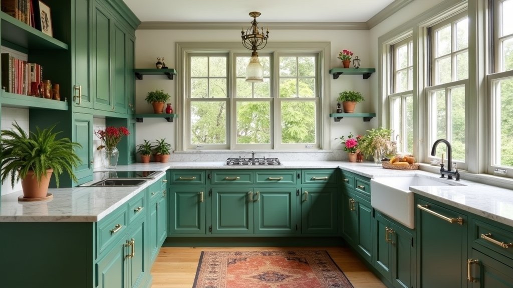 If you’re ready to elevate your kitchen style, emerald green is the way to go! This luxurious hue can transform your culinary space into a glamorous retreat. Imagine gazing at deep emerald cabinets, feeling like royalty every time you cook! To make the most of this enchanting color, consider these fabulous accents: