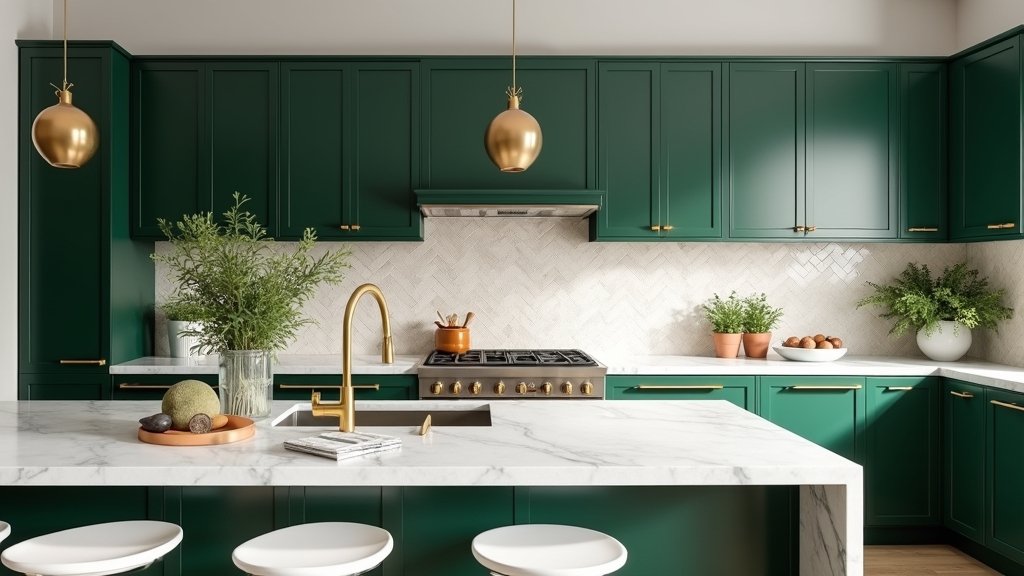 If you’ve ever dreamed of stepping into a kitchen that oozes sophistication and style, then luxurious emerald green elegance may just be your ticket! Imagine gleaming cabinets enveloped in deep, rich green hues, reflecting your passion for culinary artistry. Pair them with sleek white countertops, and you’ve got a stunning contrast that’s hard to ignore! Accent the space with gold fixtures, like gleaming handles or chic light fixtures, bringing a touch of glamour. Think of your kitchen as a chic cocktail party, where every detail invites admiration. What about plush, velvet bar stools in a complementary shade? Sounds inviting, right? With the right elements, you can create a haven that elevates your cooking experience to a delightful masterpiece! So, are you ready to transform?