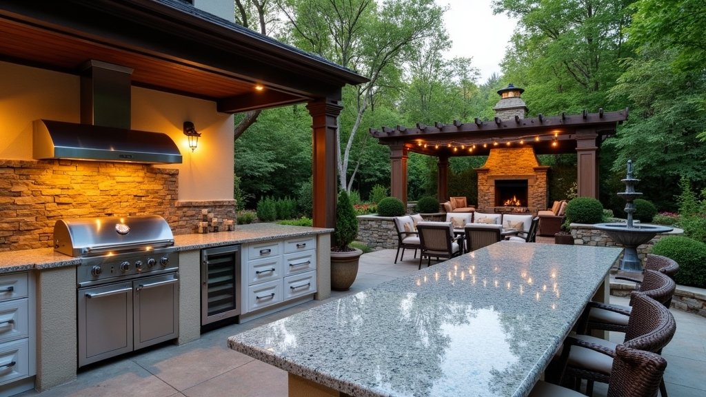 - Luxurious outdoor kitchens feature elegant materials and ambient lighting, perfect for hosting gatherings in a backyard oasis.